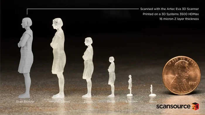 今回作られた極小フィギュアも3Dsystemsの高性能3DプリンターProJet 3500 HDMaxを使用したものだ。下記の画像は、scansource3dがつくった高さ5mmのフィギュアの大きさを比較したもの。