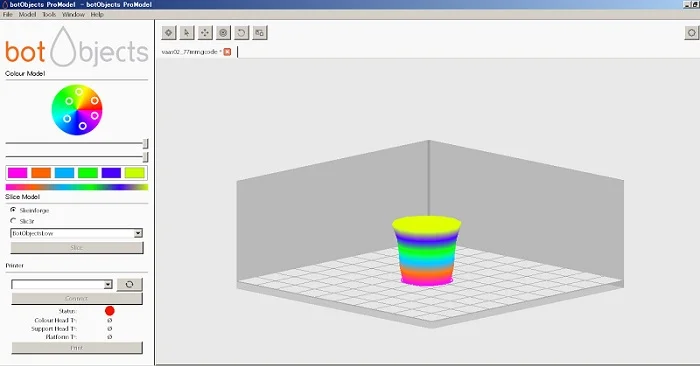 botObjectsのProdesk3Dのフルカラー技術は5色のPLAフィラメントを混合することで再現している。5色はシアン、マゼンダ、イエロー、ブラック、ホワイトで色の混合はソフトウェア上で簡単に設定できる。1色でもプリントできるがProdesk3Dの最大の特長はポインティングすることで物体のカラーを自由にグラデーションが出せる点にある。