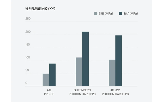 POTICONフィラメントのもう一つの特長が、射出成型品と同等の強度です。グーテンベルクのPOTICONの層間密着性は非常に強く、XY方向では、射出成型品以上の引張強度、曲げ強度を実現しました。